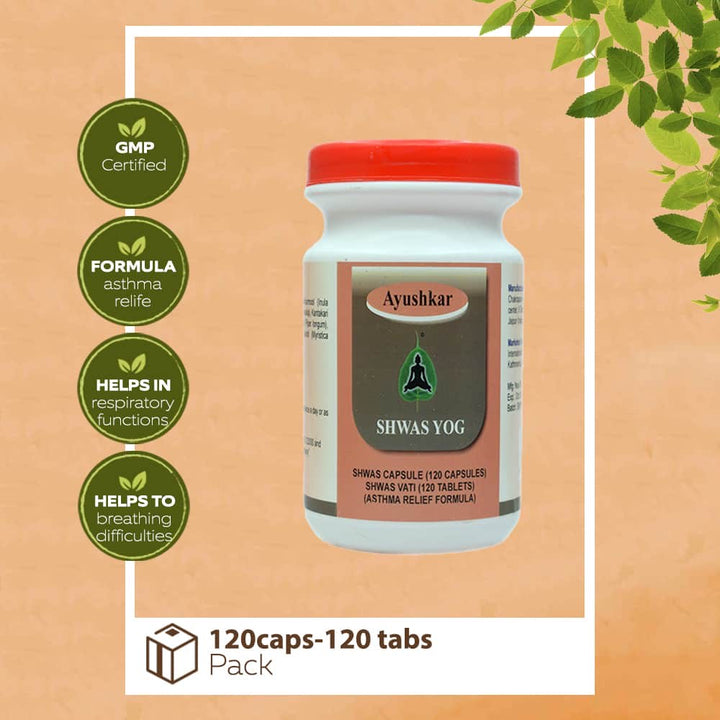 Shwas Yog is a unique formula helps to cope with asthma related breathing difficulties. This blend is a combination of Shwas Capsule and Shwas tablet.